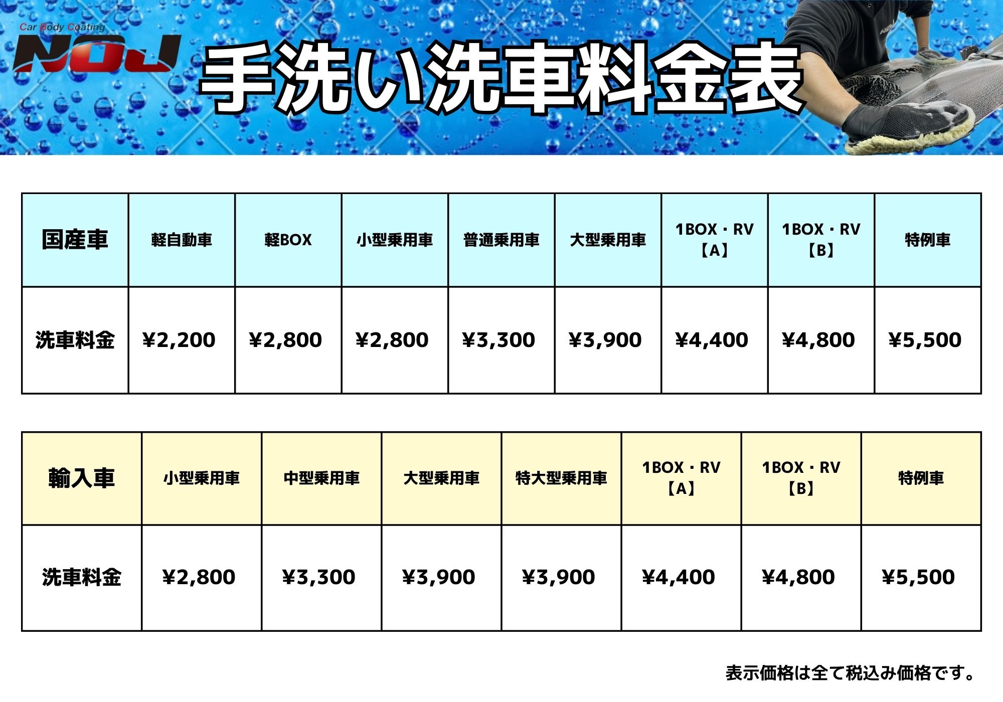 気になる洗車料金は下記の料金表をご確認くださいませ。